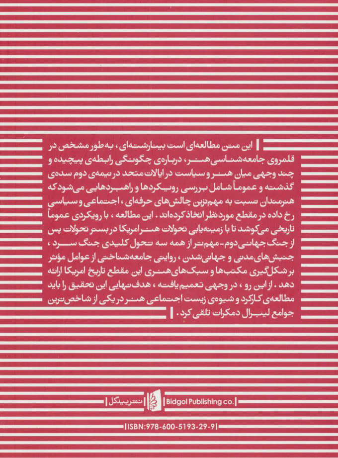 این متن مطالعهای است بینارشتهای، به طور مشخص در قلمروی جامعهشناسیهنر، دربارهی چگونگی رابطهی پیچیده و چند وجهی میان هنر و سیاست در ایالات متحده در نیمهی دوم سدهی گذشته و عموماً شامل بررسی رویکردها و راهبردهایی میشود که هنرمندان نسبت به مهمترین چالشهای حرفهای، اجتماعی و سیاسی رخ داده در مقطع مورد نظر اتخاذ کردهاند. این مطالعه با رویکردی عموماً تاریخی میکوشد تا با زمینهیابی تحولات هنر امریکا در بستر تحولات پس از جنگ جهانی دوم مهمتر از هم سه تحول کلیدی جنگ سرد، جنبشهای مدنی و جهانیشدن، روایتی جامعهشناختی از عوامل مؤثر بر شکلگیری مکتبها و سبکهای هنری این مقطع تاریخ امریکا ارائه دهد. از این رو، در وجهی تعمیمیافته، هدفنهایی این تحقیق را باید مطالعهی کارکرد و شیوهی زیستاجتماعی هنر در یکی از شاخصترین جوامع لیبرال دمکرات تلقی کرد.