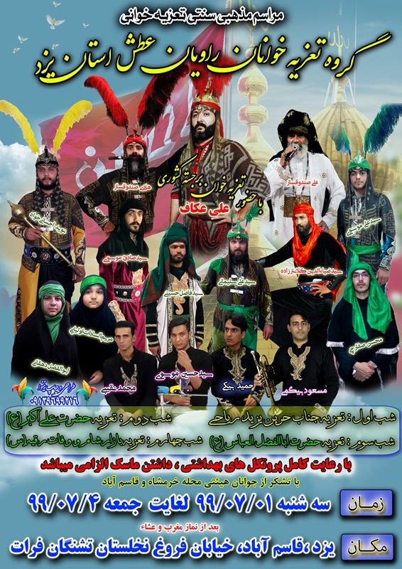 این مراسم یکم تا چهارم مهرماه بعداز نماز مغرب و عشاء در قاسم آباد، خیابان فروغ، نخلستان تشنگان فرات برگزار میشود و هر شب به یک تعزیه اختصاص دارد.
