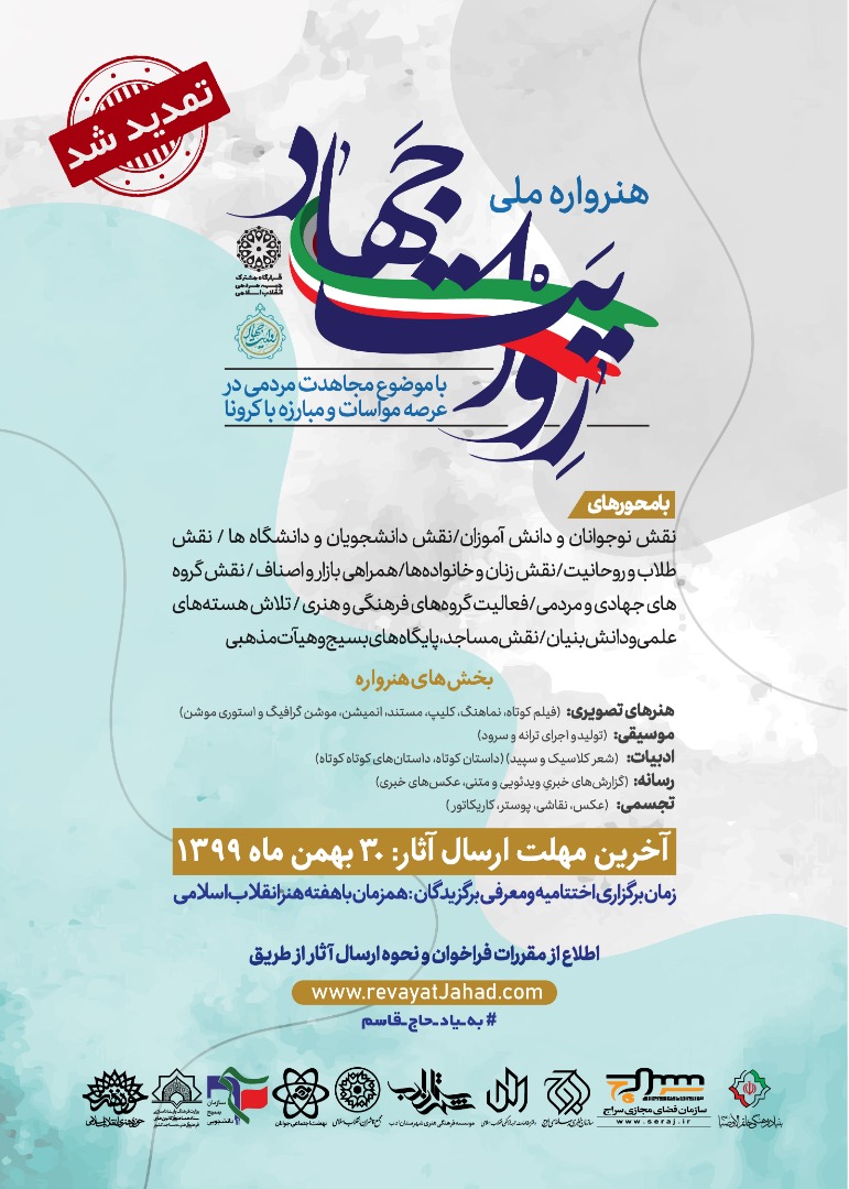 هنرواره ملی «روایت جهاد» با موضوع مجاهدتهای مردمی در عرصه مواسات و مبارزه با ویروس کرونا دربخشهای هنرهای تصویری شامل: فیلم کوتاه، نماهنگ، کلیپ، مستند، انیمیشن ـ بخش موسیقی شامل: ترانه، سرود ویدئوموزیک ـ بخش شعر و داستان شامل: داستان، داستان کوتاه، شعر سنتی ـ کلاسیک ـ سپید ـ بخش تجسمی شامل: عکس، نقاشی، گرافیک، کاریکاتور، تصویرسازی و بخش رسانه شامل: گزارشهای خبری، خبرهای تحلیلی مکتوب و تصویری و عکس خبری آماده دریافت آثار همه علاقهمندان است.