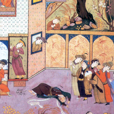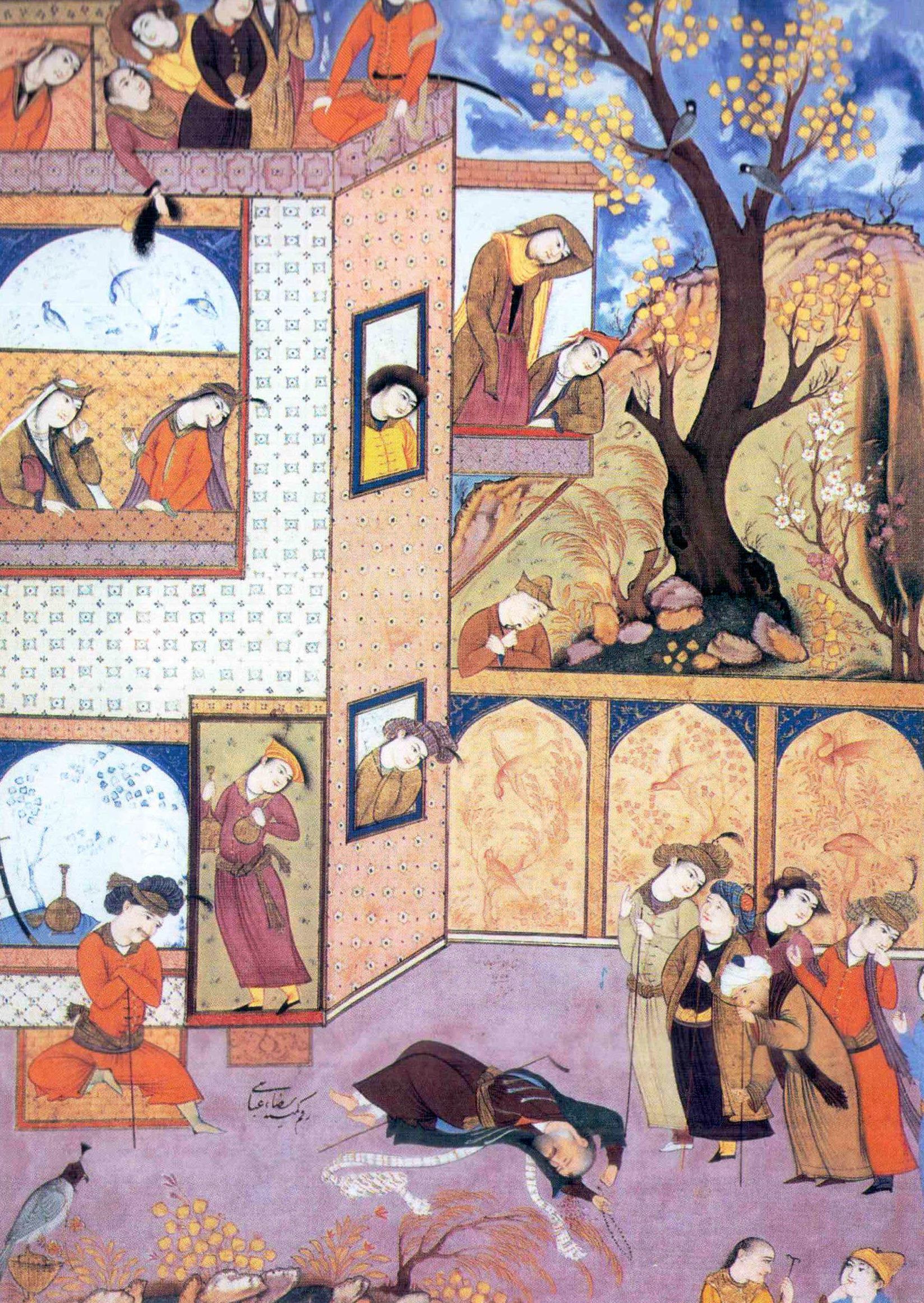 عاقبت پیرمرد بلهوس/ از فهت اورنگ جامی/ امضای معین مصور و امضای دروغین رضا عباسی/ اصفهان/ 1507 هجری مطابق با 1647 میلادی/ آبرنگ مات و طلا و مرکب روی کاغذ/ 16.6 در25 سانتی متر/ موزه بریتانیا