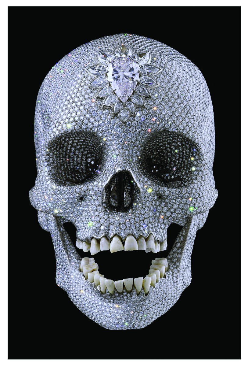 "برای عشق خدا" مجسمه ای است شاملِ یک قالب پلاتینی از جمجمه انسان قرن هجدهم، که با 8601 الماس بی عیب و نقص پوشانده شده است، از جمله یک الماس صورتی گلابی شکل که در پیشانی آن قرار دارد و به این نام معروف است. الماس ستاره جمجمه. دندان های جمجمه اصلی هستند و توسط هرست در لندن خریداری شده است. اثر هنری که یادآورِ مرگِ بیننده است. در حقیقت یک جمجمه بسیار گرانبها هم نمی تواند مرگ را به تعویق بیندازد.