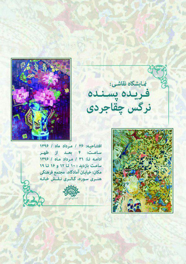 نمایشگاه نقاشی فریده پسنده و نرگس چقاجردی در ساعت 16 روز پنج شنبه 26 مردادماه در گالری نقش خانه اصفهان افتتاح خواهد شد. این نمایشگاه از ساعت 10 صبح الی 12 ظهر و 16 الی 19 شب تا روز سه شنبه 31 مردادماه جهت بازدید عموم دایر است.