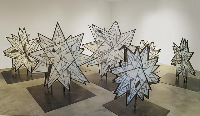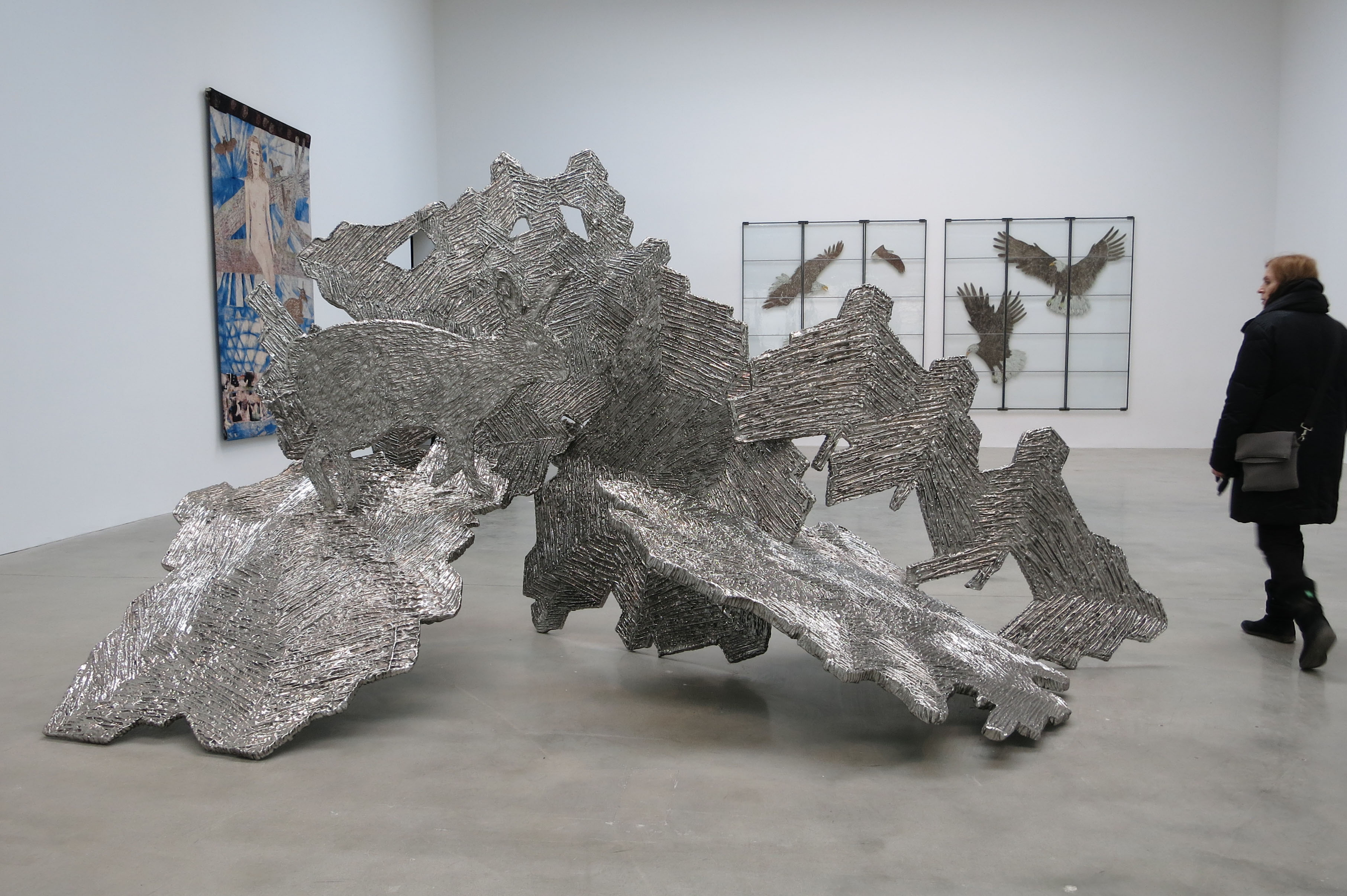 اینستالیشن "Wonder" در پیش زمینه، "Hoarfrost with Rabbit"، فولاد ضد زنگ، 2014، در گالری Pace