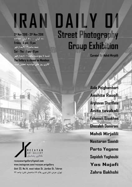 به گزارش روابط عمومی مرکز تجسمی حوزه هنری، نمایشگاه گروهی عکس خیابانی «هر روز ایران ۰۱» (Iran Daily 01) از روز جمعه 11 آبان در گالری رضائیان واقع در خیابان جردن، تابان غربی، پلاک 14 (ساختمان تابان)، واحد 23 برقرار می باشد.