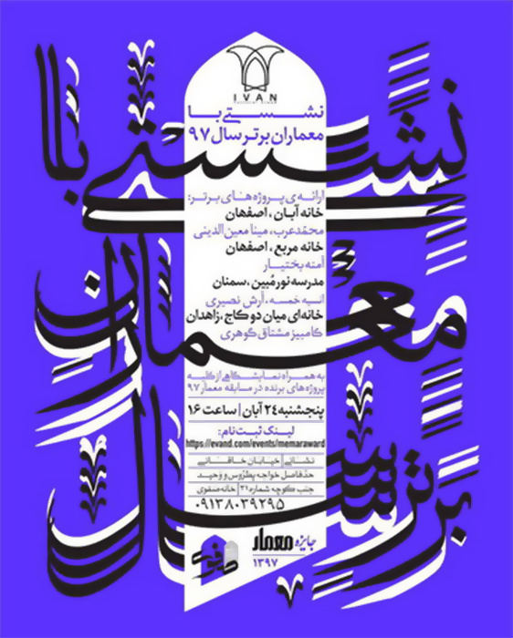 نشستی با معماران برتر سال ۹۷ روز پنجشنبه ۲۴ آبان ماه ساعت ۱۶ در خانه صفوی واقع در خیابان خاقانی، حد فاصل خواجه پطروس و وحید جنب کوچه شماره ۳۱ برگزار میشود.