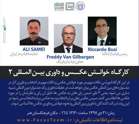 به گزارش روابط عمومی مرکز تجسمی حوزه هنری، کارگاه «خوانش عکس و داوری بین المللی» ۲۱ دی با حضور ریکاردو بوسی رییس فیاپ از ایتالیا، فردی ون گیلبرگن معاون فیاپ از بلژیک و علی سامعی نماینده فیاپ در ایران برگزار می‎شود.