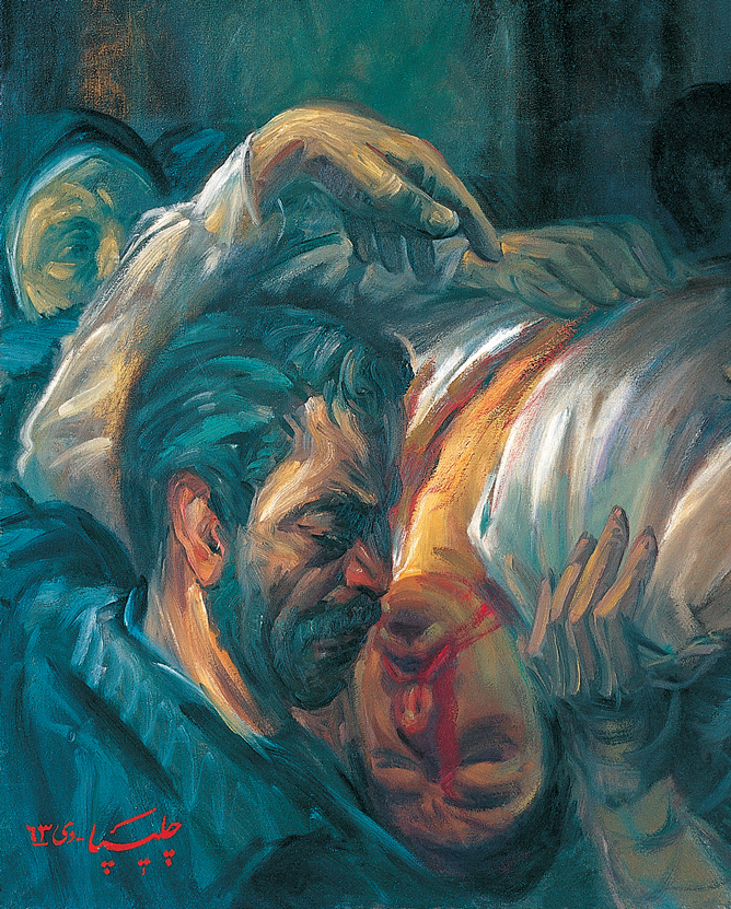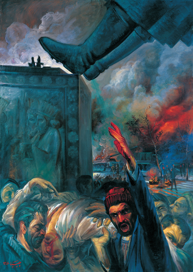 صفحه جلو و نقطه عطف تابلو، فضایی است از حمل شهیدی غرق در خون و بی‌گناه که توسط عده‌ای از مردم عادی حمایت و همراهی می‌شود. لباس شهید به رنگ سفید، و حکایت از بی‌گناهی و پاکی او دارد. حرکت اُریب دست مردی که در سمت راست تابلو قرار گرفته حاکی از حرکت به سمت جلو بر ضد نظام پادشاهی است که به رنگ خون نقاشی شده است. تصویر این آدم نیز حکایت از راه پر خون و پر حادثه‌ای می‌کند که مردم ایران در پیش‌رو داشتند. این اثر در ساختار خود فیگوراتیو است. اغراق در فرم و رنگ‌های موجود، فضا را به سمت اکسپرسیو نزدیک کرده تا بیان احساسات و شور و حال آن دوران را بیشتر تداعی کند.