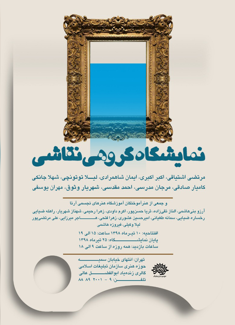 گفتنی است، نمایشگاه گروهی نقاشی جمعی از هنرمندان و اساتید نقاشی به همراه جمعی از هنر آموختگان آموزشگاه هنرهای تجسمی آرتا 10 الی 25 تیرماه 98 همه روزه از ساعت 9 الی 18 گالری زندهیاد ابولفضل عالی میزبان علاقهمندان خود خواهد بود.