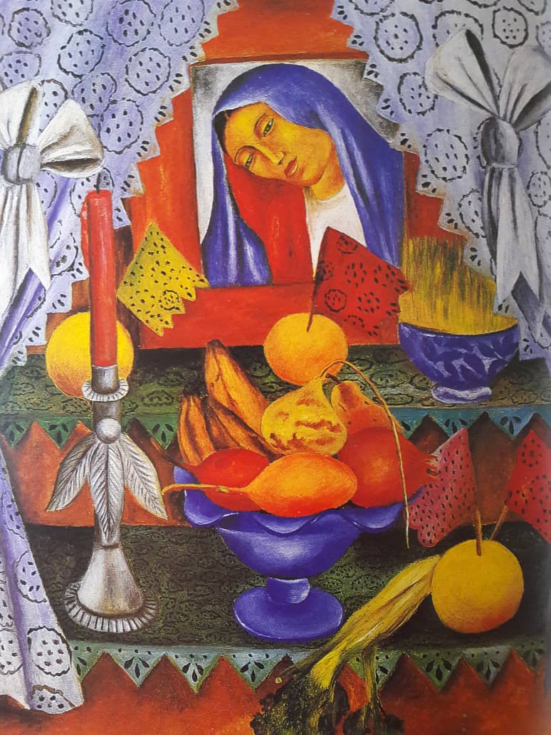 در تابلوی "محراب مریم عذرای داغدار"، "ایسکیریدو" در عین حال که احساسات مذهبی رایج بین هم وطنانش را بیان کرده، تک چهره گویایی از خود نیز آفریده است. "ایسکیریدو" گنجینه های شخصی خود را، که به کلی برگرفته از فرهنگ همگانی مکزیکی هاست، به صورت اشاراتی به زندگی شخصی خود، در حاشیه پیش زمینه تصویر قرار داده است. در پس زمینه، "ایسکیردو" تصویر قدیسی هم نام خود را، که در سراسر عمر هویت خویش را از او می دانسته، گذاشته است.