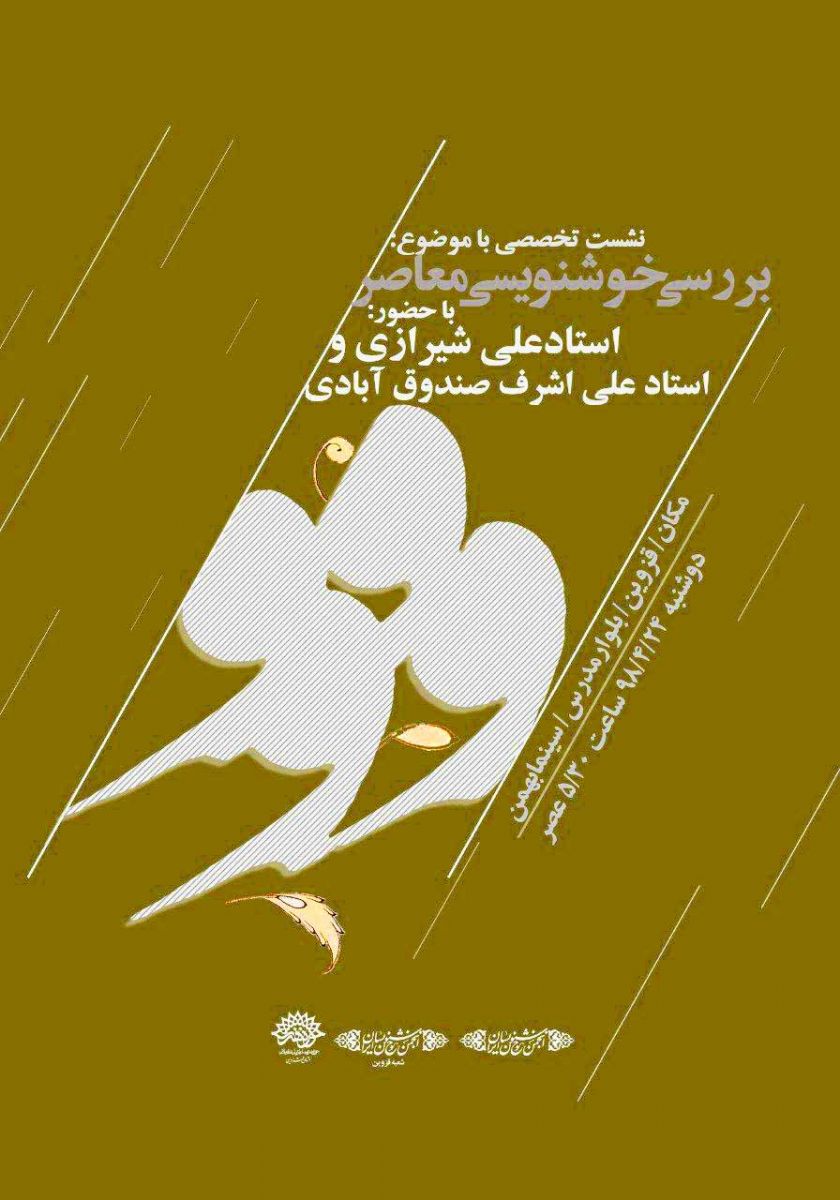 به گزارش روابط عمومی حوزه هنری؛ در این نشست استاد علی شیرازی و استاد علی اشرف صندوق آبادی، (بصورت اسلاید) به تحلیل و بررسی آثار شاخص خوشنویسان دوره معاصر خواهند پرداخت. این برنامه دوشنبه: ۲۴ تیرماه جاری، ساعت: ۱۷:۳۰ در سالن سینما بهمن، واقع در؛ بلوار مدرس جنوبی، روبروی بوستان ملت، پلاک ۷۰ برگزار خواهد شد.