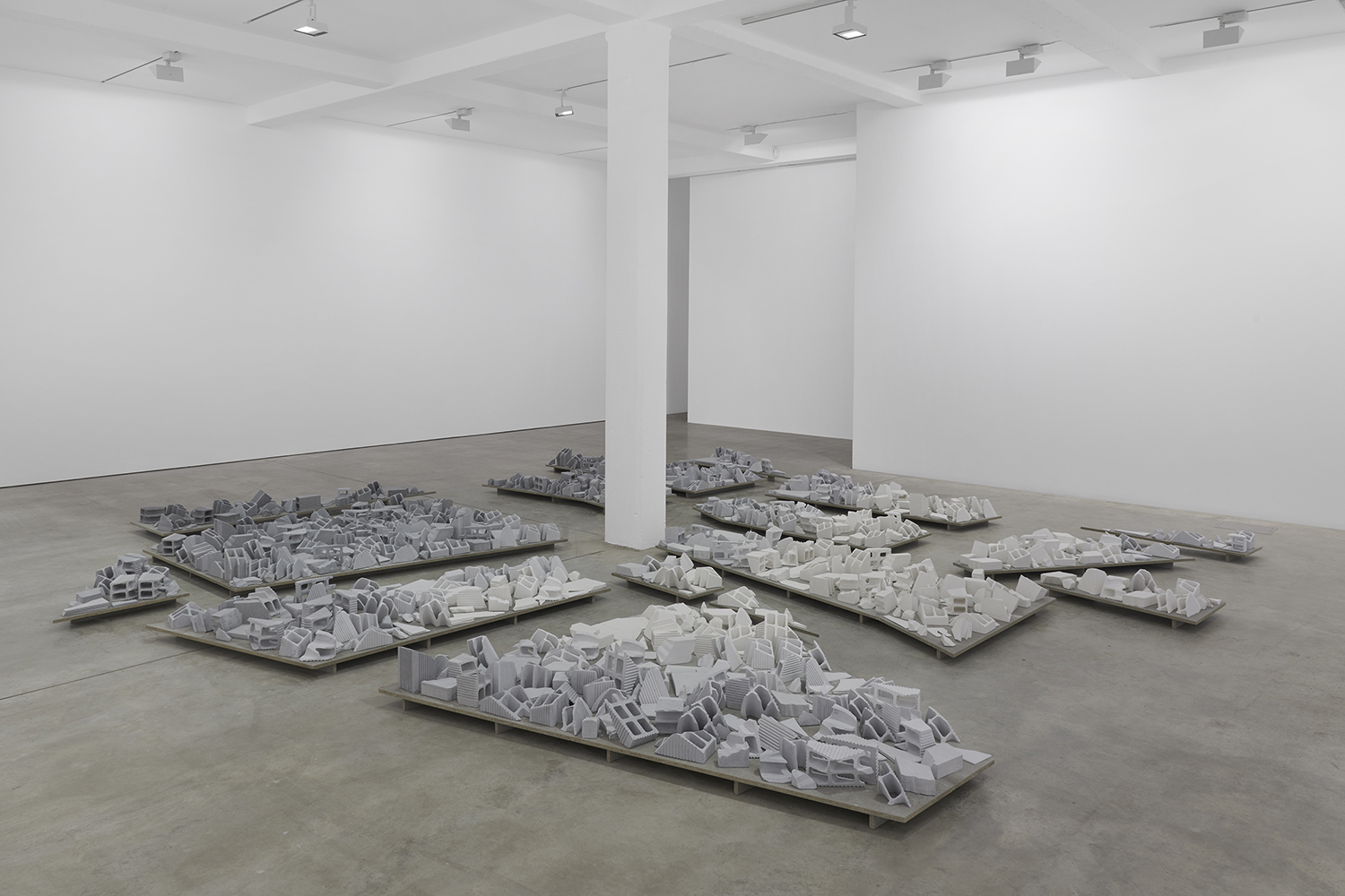 در طبقه هم کف گالری، مجموعهای با عنوان "مکانیزم رشد، تخریب ساختمانها و خرید ضایعات" از نازگل انصارینیا توجه مخاطبان را به خود جلب میکند. آنچه بهعنوان تکههای نخاله به چشم میآید در واقع قطعات دستساز گچی هستند که براساس یک قالب چاپی سهبعدی ساخته شدهاند و قطعات متلاشی ساختمانی را متبادر میکنند. در تهران، محل زندگی این هنرمند؛ در دهههای اخیر موج تخریب و بازسازی آنارشیستهای حوزه املاک و مستغلات، شهری را که زمانی آشنا بود، دستخوش تغییرات مداوم کرده است. انصارینیا جزییات بیرحمانه و انحصارطلبانه این تخریب شایع در سراسر این شهر را ثبت نموده است.