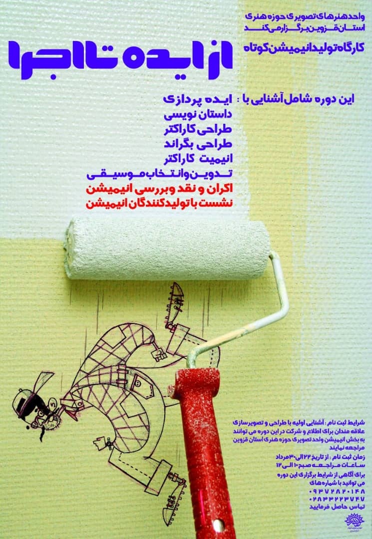 علاقه مندان جهت آشنایی با مبانی طراحی و تصویرسازی می توانند حداکثر تا ۳۰ مردادماه جاری همه روزه از ساعت:۱۰ تا ۱۲ به خانه انیمیشن واحد هنرهای تصویری این مرکز، واقع در بلوار مدرس جنوبی، روبروی بوستان ملت، جنب سینما بهمن، پلاک ۷۰ حوزه هنری قزوین مراجعه نمایند و یا جهت کسب اطلاعات بیشتر با شماره های؛ ۰۹۳۷۲۸۲۰۱۴۸ و ۰۲۸۳۳۲۲۳۷۴۷ تماس حاصل نمایند.