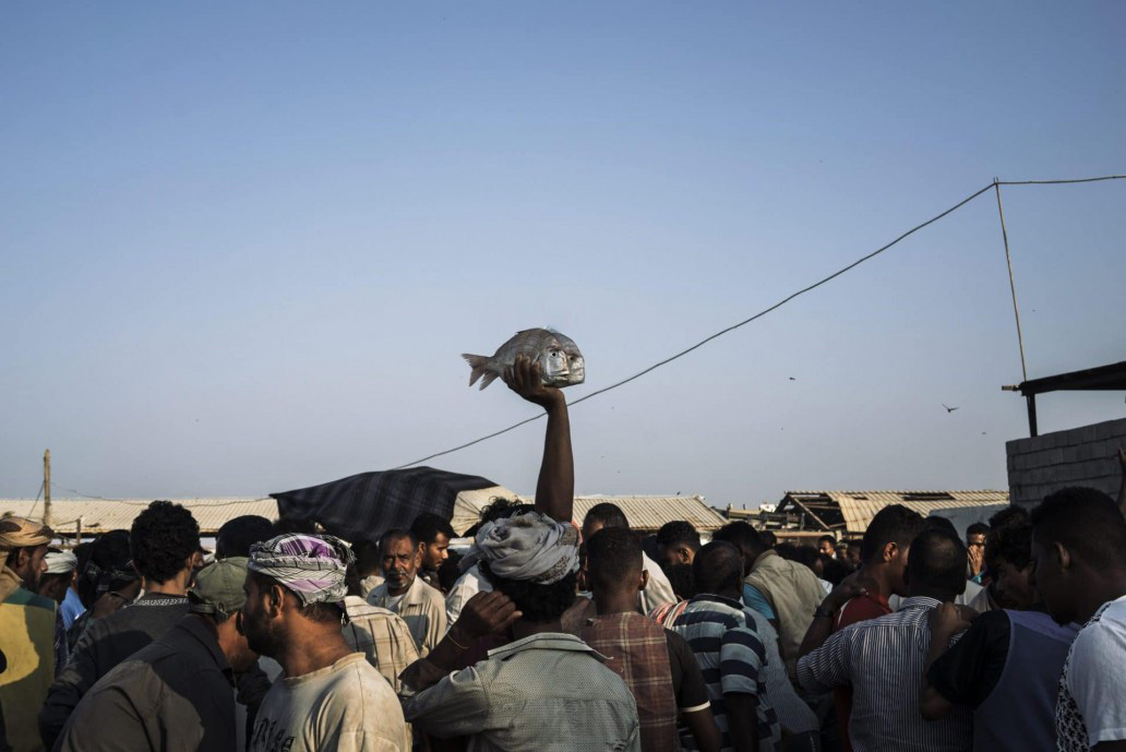 در توضیح این عکس از یمن آمده است: مردانی که در بازار ماهی فروشان یمن در نزدیکی بندر کار می‌کنند. درگیری‌های مسلحانه در جریان به شدت ماهیگیران را تهدید می‌کنند. تعداد اندکی از آنان برای صید به دریا می‌روند. گفته می‌شود قایق‌های ماهیگیری مورد هدف نیروهای ائتلاف سعودی قرار گرفته و نابود شده‌اند.