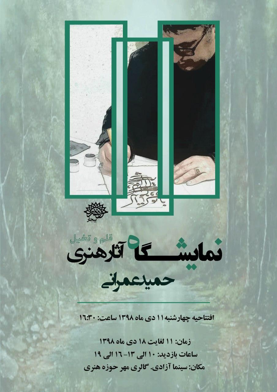 به گزارش روابط عمومی حوزه هنری انقلاب اسلامی استان کردستان ؛ دراین نمایشگاه تعداد ۱۸ تابلوی نقاشی در سبک رئالیسم و تکنیک رنگ وروغن با موضوع آزاد و ۸ تابلوی خوشنویسی نستعلیق آثار "حمید عمرانی " از هنرمندان پیشکسوت شهرستان بیجار در گالری مهر حوزه هنری این شهر به نمایش در می آید .